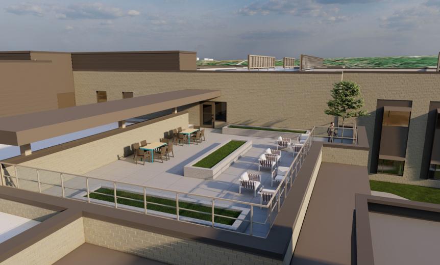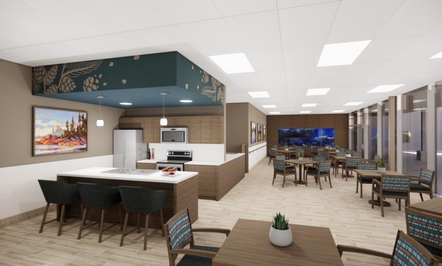 - Larger dining room to support two smaller 16-resident dining spaces to create a more pleasurable dining experience with less noise and more community feel.