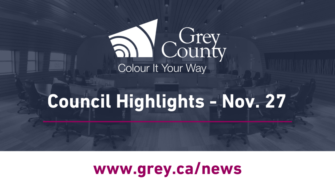 The Clerk’s Department maintains the official records for Grey County. This publication is intended to provide meeting highlights only. For official records, please refer to the meeting minutes, or contact the Clerk’s Department at 1-800-567-4739.